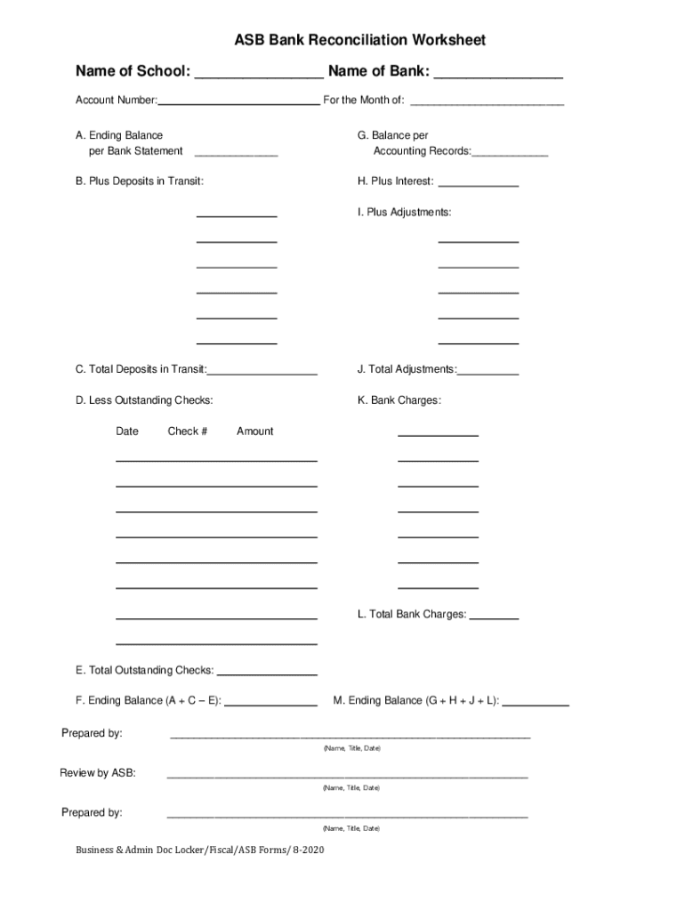 ASB Bank Reconciliation Worksheet Name of School: ___ Name of Bank: ___ Account Number:For the Month of: ___A. Ending Balance per Bank Statement. Balance per Accounting Records:______B. Plus Deposits