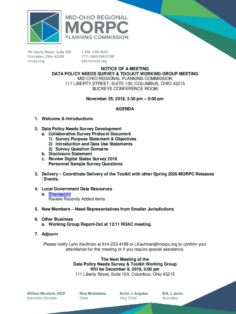 NOTICE OF A MEETING DATA POLICY NEEDS SURVEY & TOOLKIT WORKING GROUP MEETING OHIO REGIONAL PLANNING COMMISSION 111 LIBERTY STREET, SUITE 100, COLUMBUS, OHIO 43215 BUCKEYE CONFERENCE ROOM November