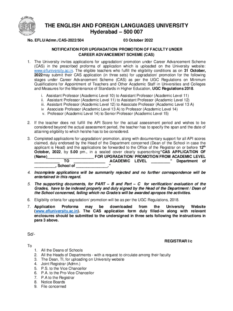 THE ENGLISH AND FOREIGN LANGUAGES UNIVERSITY Hyderabad 500 007 No. FLU/Aden./CAS2022/50403 October 2022NOTIFICATION FOR Upgrade/ PROMOTION OF FACULTY UNDER CAREER ADVANCEMENT SCHEME (CAS) 1. The University
