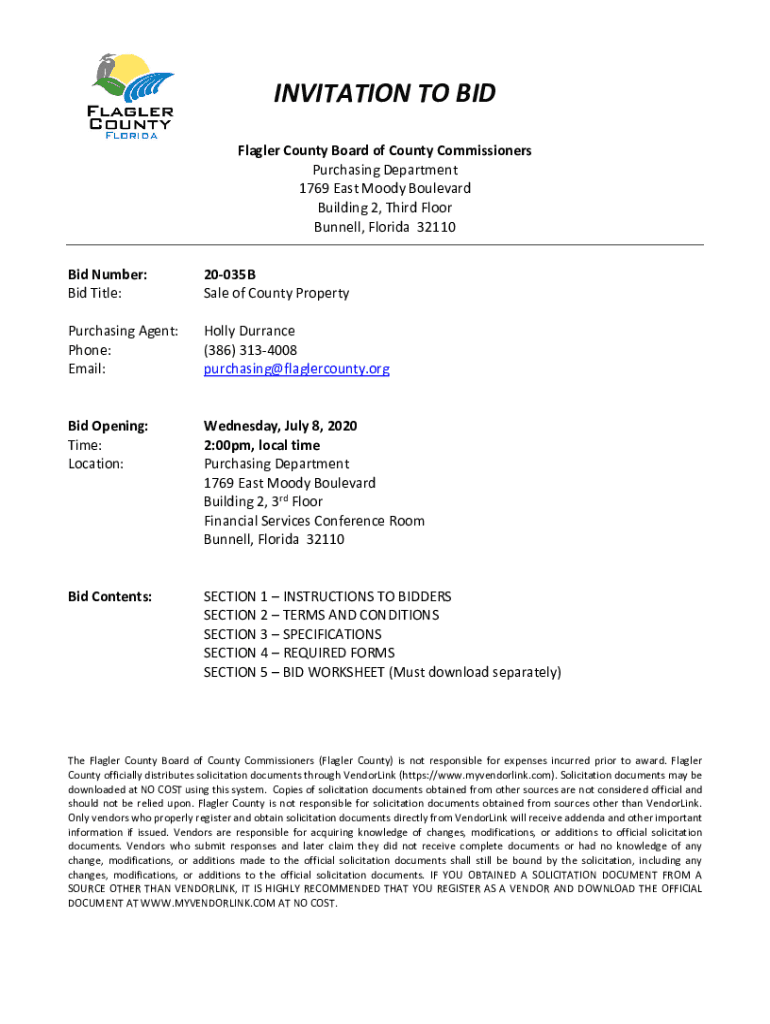 INVITATION TO BID Flagler County Board of County Commissioners Purchasing Department 1769 East Moody Boulevard Building 2, Third Floor Bonnell, Florida 32110 Bid Number: Bid Title:20035B Sale of County