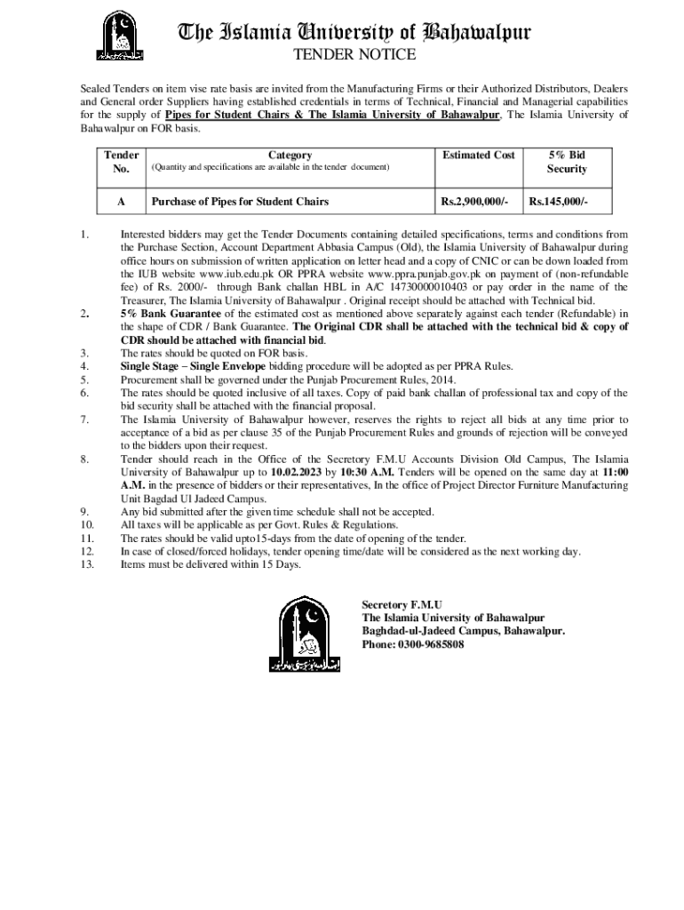 The Islamic University of Bahawalpur TENDER NOTICE Sealed Tenders on item vise rate basis are invited from the Manufacturing Firms or their Authorized Distributors, Dealers and General order Suppliers