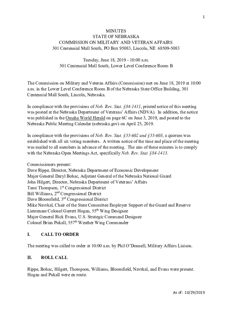 1MINUTES STATE OF NEBRASKA COMMISSION ON MILITARY AND VETERAN AFFAIRS 301 Centennial Mall South, PO Box 95083, Lincoln, NE 685095083 Tuesday, June 18, 2019 10:00 a.m. 301 Centennial Mall South, Lower