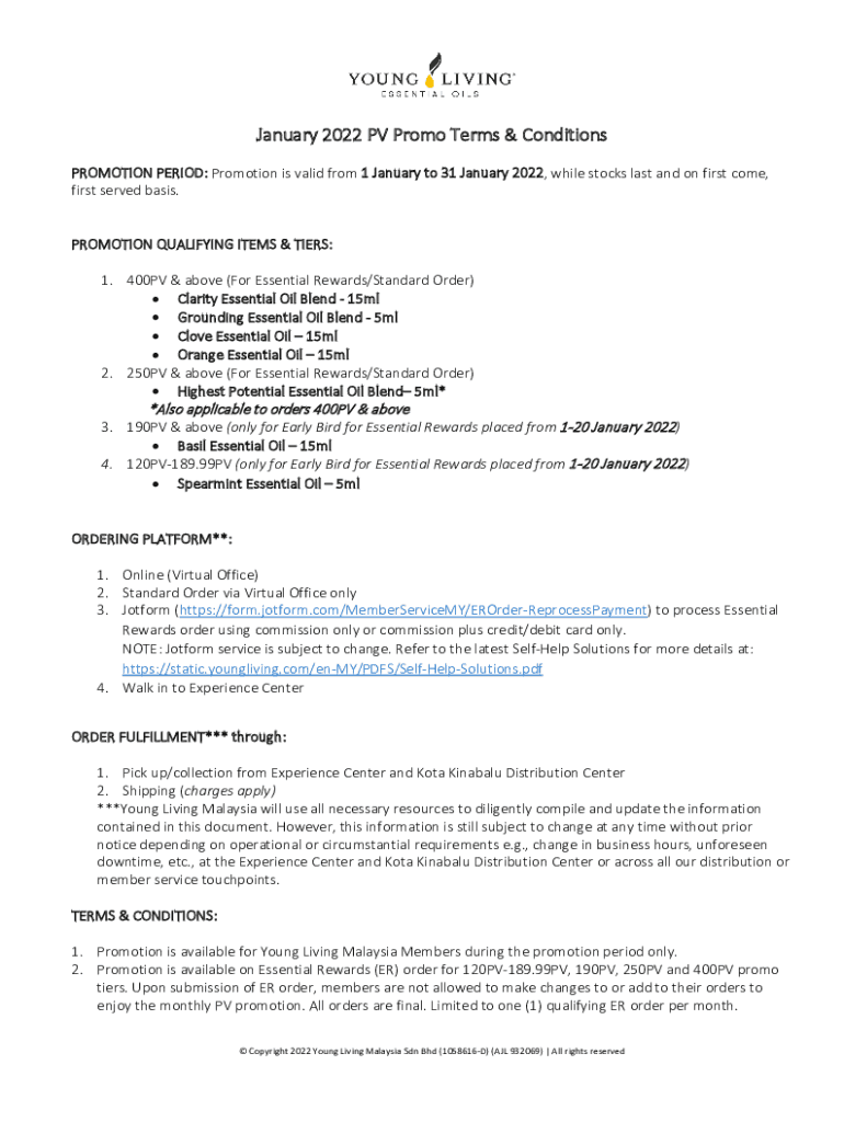 January 2022 PV Promo Terms & Conditions PROMOTION PERIOD: Promotion is valid from 1 January to 31 January 2022, while stocks last and on first come, first served basis. PROMOTION QUALIFYING ITEMS