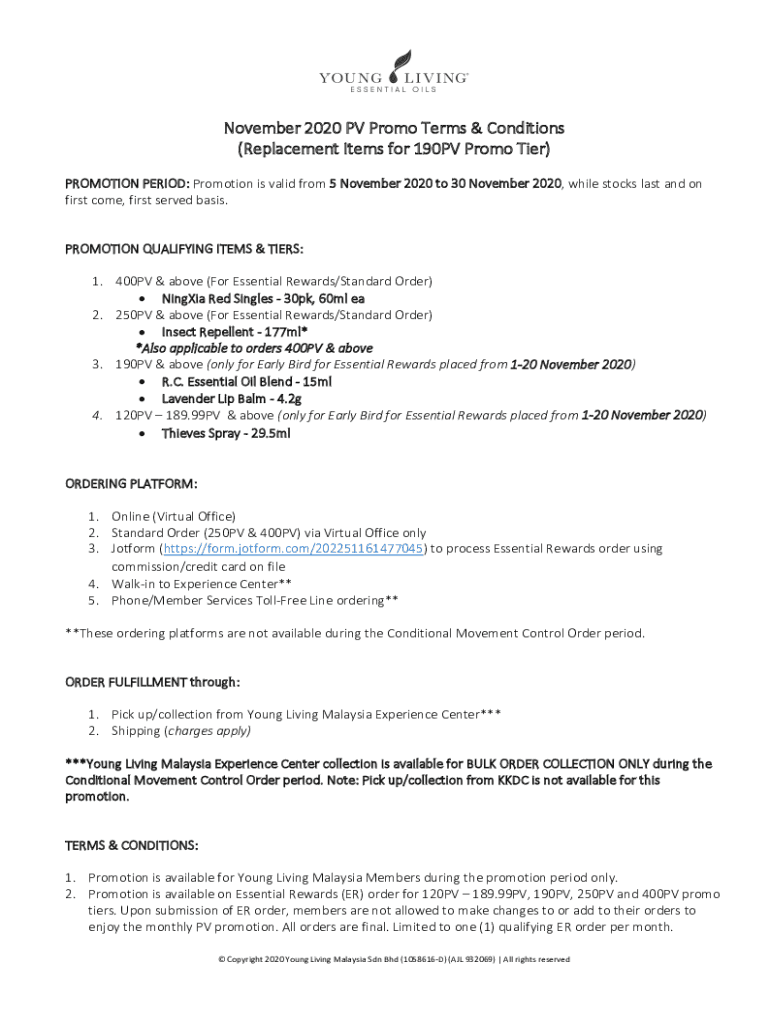 November 2020 PV Promo Terms & Conditions (Replacement Items for 190PV Promo Tier) PROMOTION PERIOD: Promotion is valid from 5 November 2020 to 30 November 2020, while stocks last and on first come,