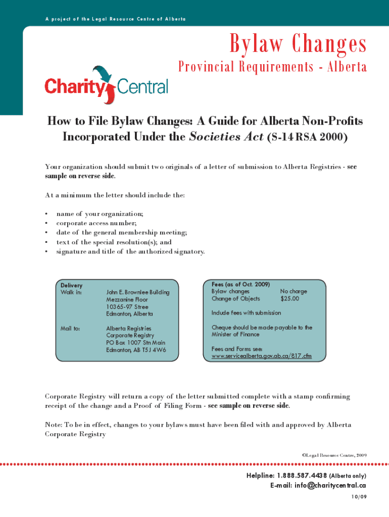 A project of the Le gal Resource CENTR e of Albert bylaw ChangesProvincial Requirements Alberta How to File Bylaw Changes: A Guide for Alberta Nonprofits Incorporated Under the Societies Act (S14