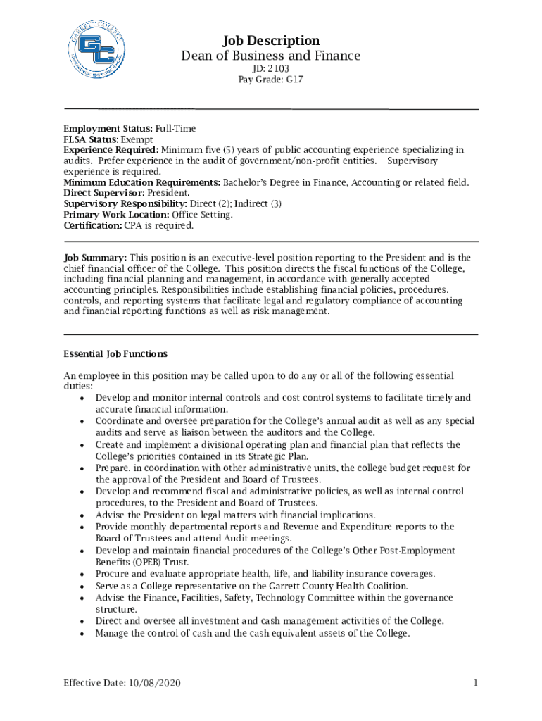 Job Description Dean of Business and Finance JD: 2103 Pay Grade: G17Employment Status: Halftime FLEA Status: Exempt Experience Required: Minimum five (5) years of public accounting experience specializing