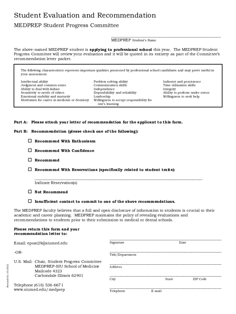 Student Evaluation and Recommendation MERE Student Progress Committee ___ MERE Students Name The above named MERE student is applying to professional school this year. The MERE Student Progress Committee