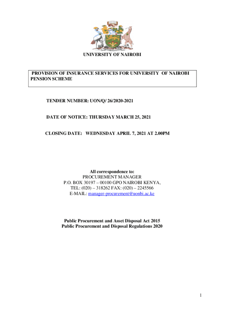 UNIVERSITY OF NAIROBIPROVISION OF INSURANCE SERVICES FOR UNIVERSITY OF NAIROBI PENSION SCHEMETENDER NUMBER: ON/Q/ 26/20202021DATE OF NOTICE: THURSDAY, MARCH 25, 2021CLOSING DATE: WEDNESDAY, APRIL