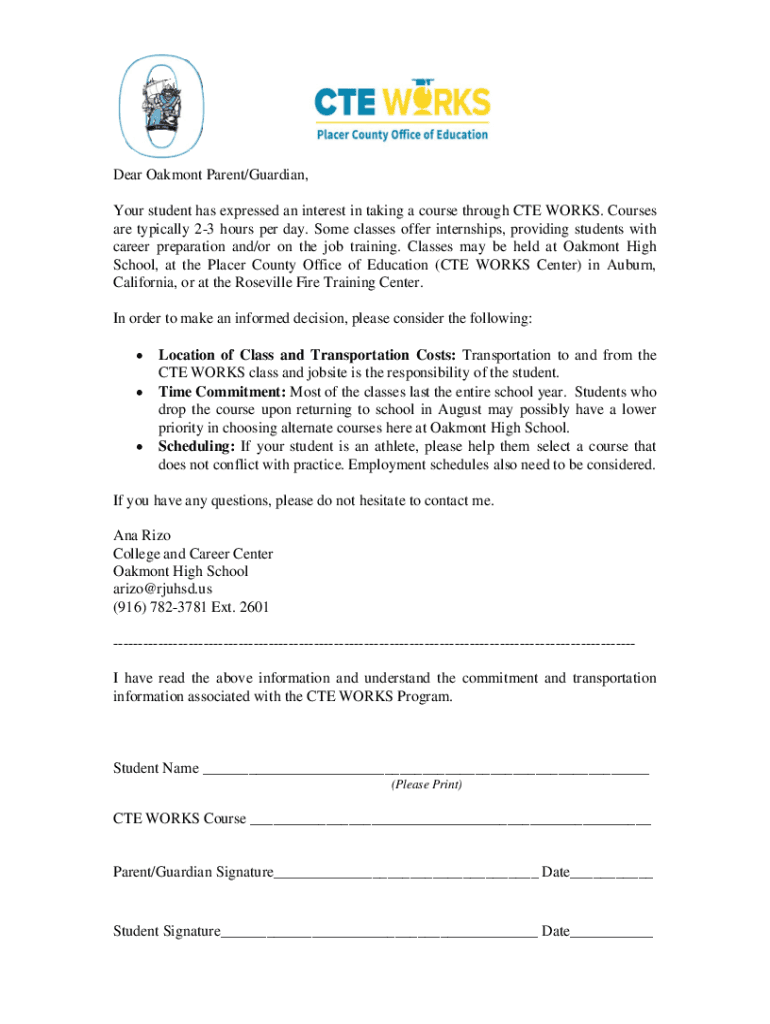 Dear Lamont Parent/Guardian, Your student has expressed an interest in taking a course through CTE WORKS. Courses are typically 23 hours per day. Some classes offer internships, providing students