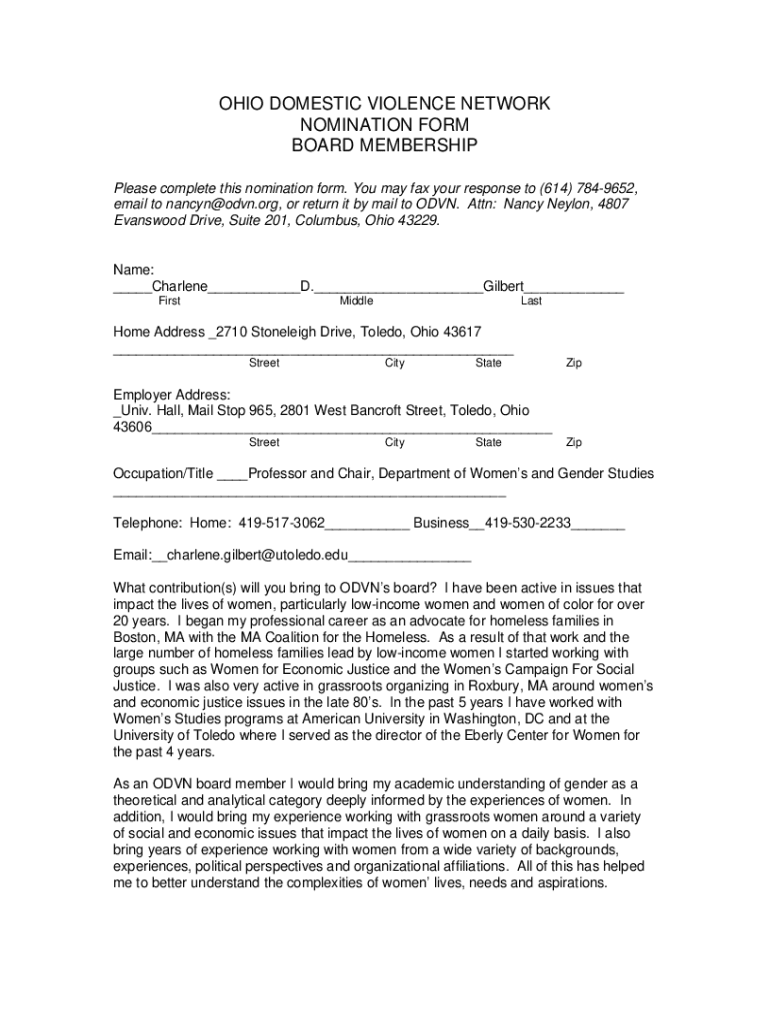 OHIO DOMESTIC VIOLENCE NETWORK NOMINATION FORM BOARD MEMBERSHIP Please complete this nomination form. You may fax your response to (614) 7849652, email to nancyn@odvn.org, or return it by mail to