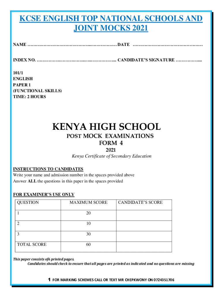 CSE ENGLISH TOP NATIONAL SCHOOLS AND JOINT MOCKS 2021 NAME. DATE INDEX NO. ......... CANDIDATES SIGNATURE .... 101/1 ENGLISH PAPER 1 (FUNCTIONAL SKILLS) TIME: 2 HOURSKENYA HIGH SCHOOL POST MOCK EXAMINATIONSFORM