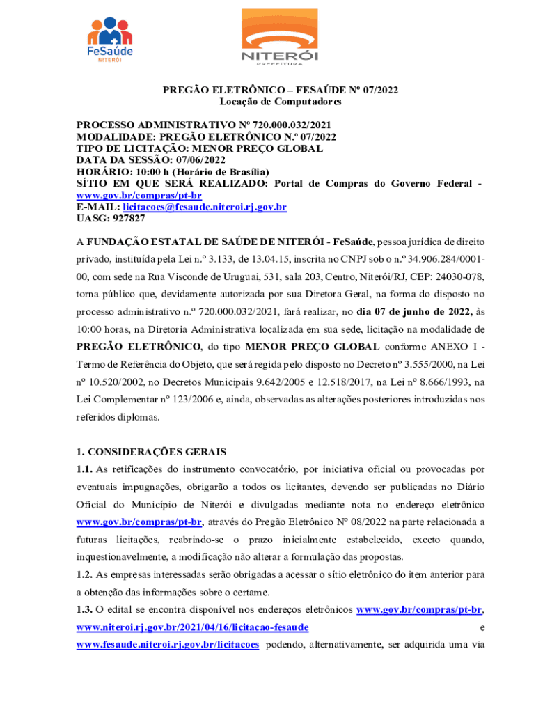 PRESO ELECTRIC FEMALE N 07/2022 Local de Computadores PROCESS ADMINISTRATIVE N 720.000.032/2021 MODALIDADE: PRESO ELECTRIC N. 07/2022 TIP ODE LICIT AO: MINOR PRO GLOBAL DATA DA SE SSO: 07/06/2022