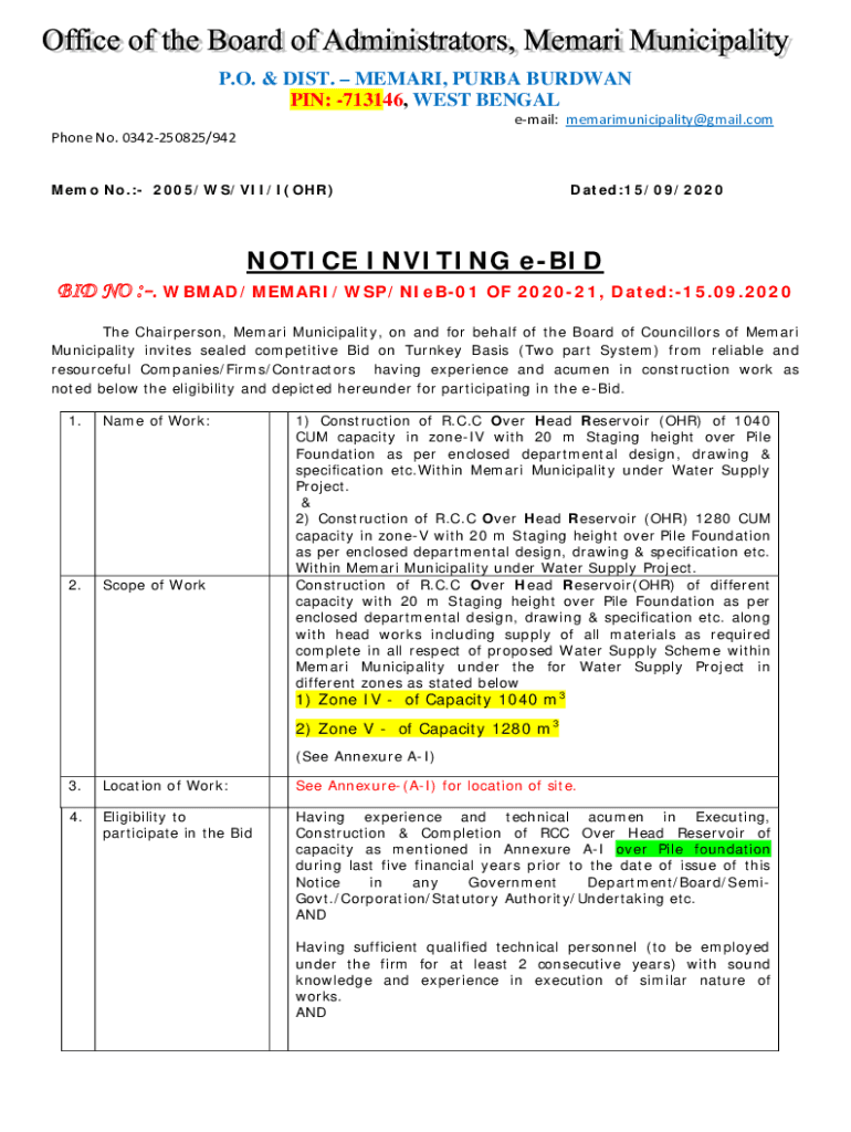 P.O. & DIST. MEMORY, PU RBA BURDEN PIN: 713146, WEST BENGALemail: memarimunicipality@gmail.comPhone No. 0342250825/942 Memo No.: 2005/WS/VII/I(OR)Dated:15/09/2020NOTICE INVITING ibid NO :. WB MAD/MEMORY/WSP/NIeB01