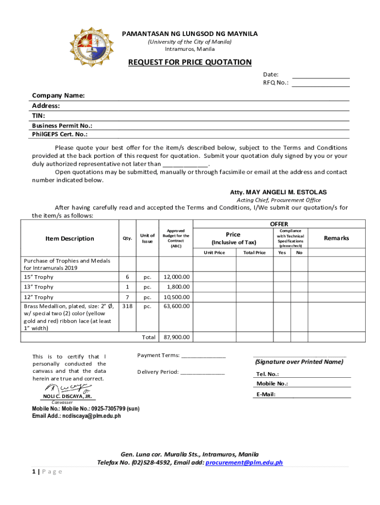 PARANASAL NG LUNG SOD NG MANILA (University of the City of Manila) Intramural, ManilaREQUEST FOR PRICE QUOTATION Date: RFQ No.:Company Name: Address: TIN: Business Permit No.: Phillips Cert. No.: