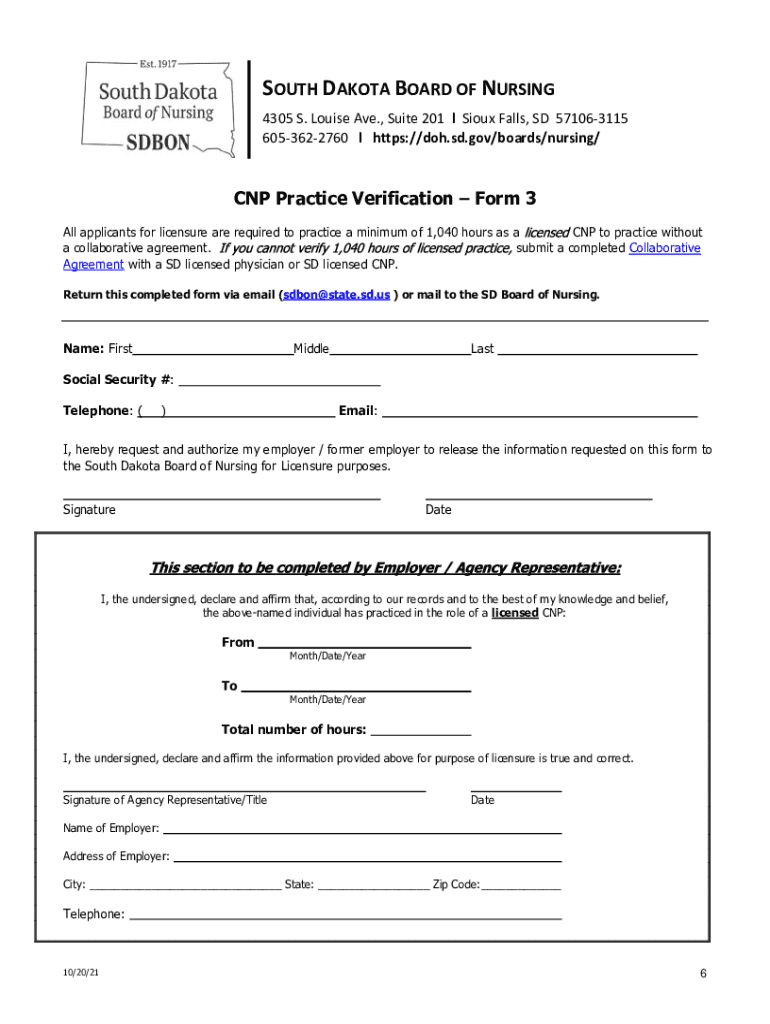 SOUTH DAKOTA BOARD OF NURSING 4305 S. Louise Ave., Suite 201 l Sioux Falls, SD 571063115 6053622760 l https://doh.sd.gov/boards/nursing/CNP Practice VerificationForm 3All applicants for licensure