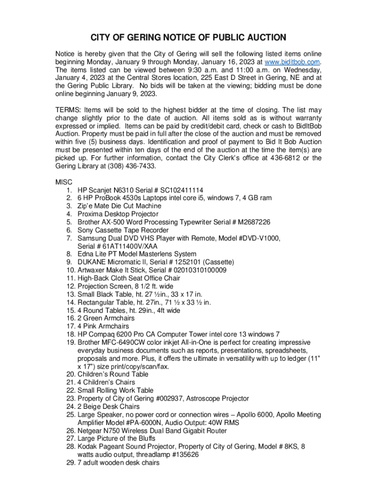 CITY OF GEARING NOTICE OF PUBLIC AUCTION Notice is hereby given that the City of Gearing will sell the following listed items online beginning Monday, January 9 through Monday, January 16, 2023, at