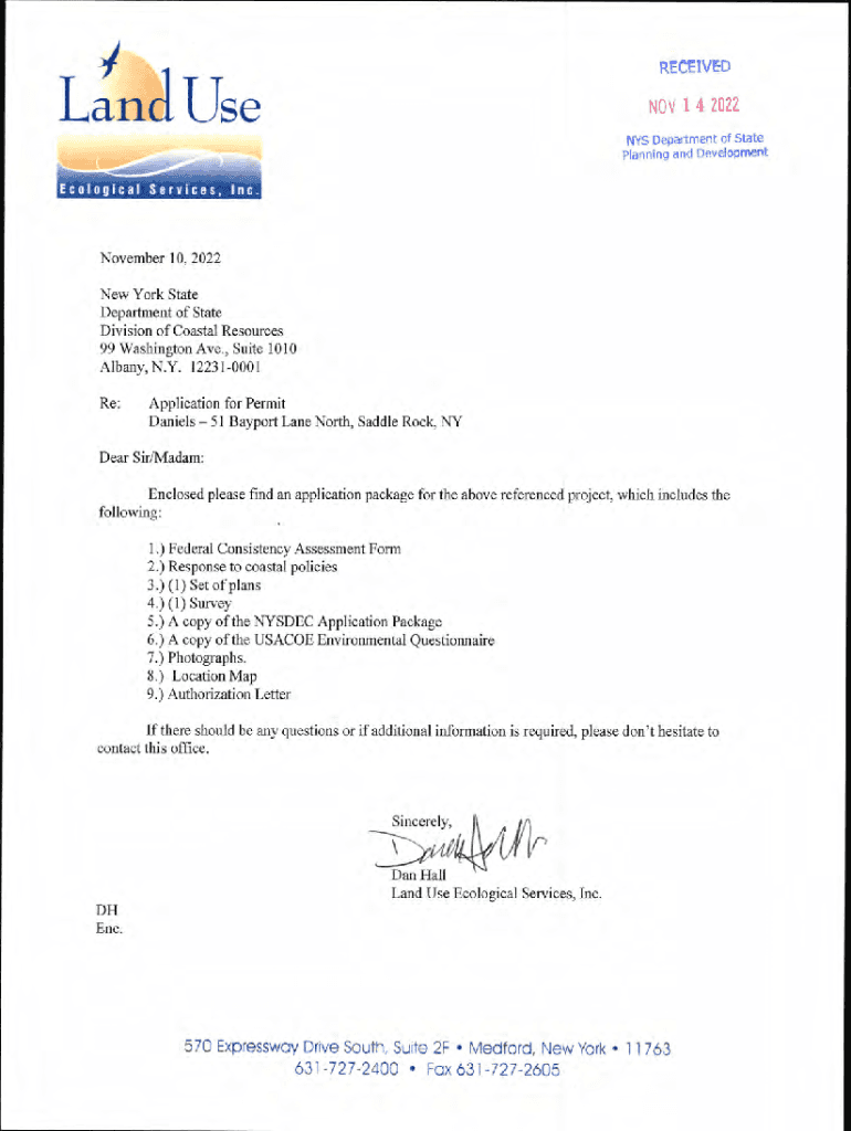 RECEIVED/L an JG\” Colony/ 14?02:NYS Department of State Planning and Developmental Services, UNC. November 10, 2022, New York State Department of State Division of Coastal Resources 99 Washington
