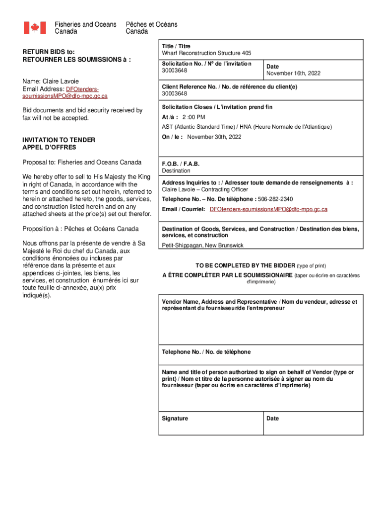 RETURN BIDS to: RETURNER LES COMMISSIONS :Name: Claire Lavoie Email Address: DFOtenderssoumissionsMPO@dfompo.gc.caBid documents and bid security received by fax will not be accepted. Title / Title