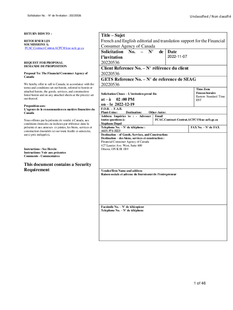 Solicitation No. N de l\'invitation : 20220536RETURN BIDS TO : RETURNER LES COMMISSIONS : FCAC.ContractContrat.ACFC@fcacacfc.gc.caREQUEST FOR PROPOSAL DEMAND DE PROPOSITION Proposal To: The Financial