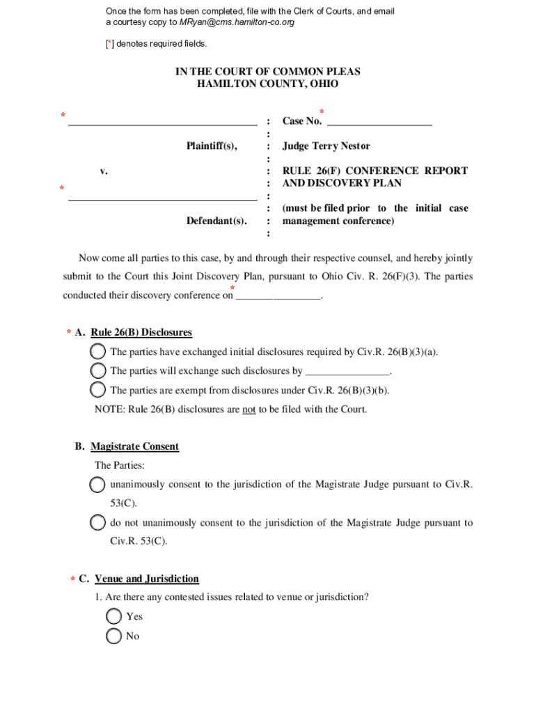 Once the form has been completed, file with the Clerk of Courts, and email a courtesy copy to MRyan@cms.hamiltonco.org [*] denotes required fields.IN THE COURT OF COMMON PLEAS HAMILTON COUNTY, OHIO