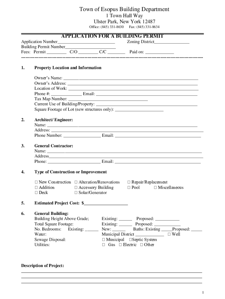 Town of Es opus Building Department 1 Town Hall Way Ulster Park, New York 12487 Office: (845) 3318630Fax: (845) 3318634APPLICATION FOR A BUILDING PERMIT Application Number___ Zoning District___ Building