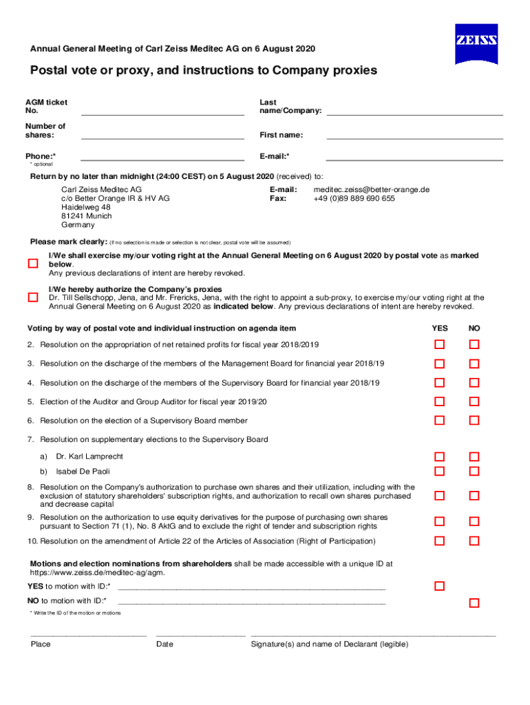 Annual General Meeting of Carl Zeiss Edited AG on 6 August 2020Postal vote or proxy, and instructions to Company proxies