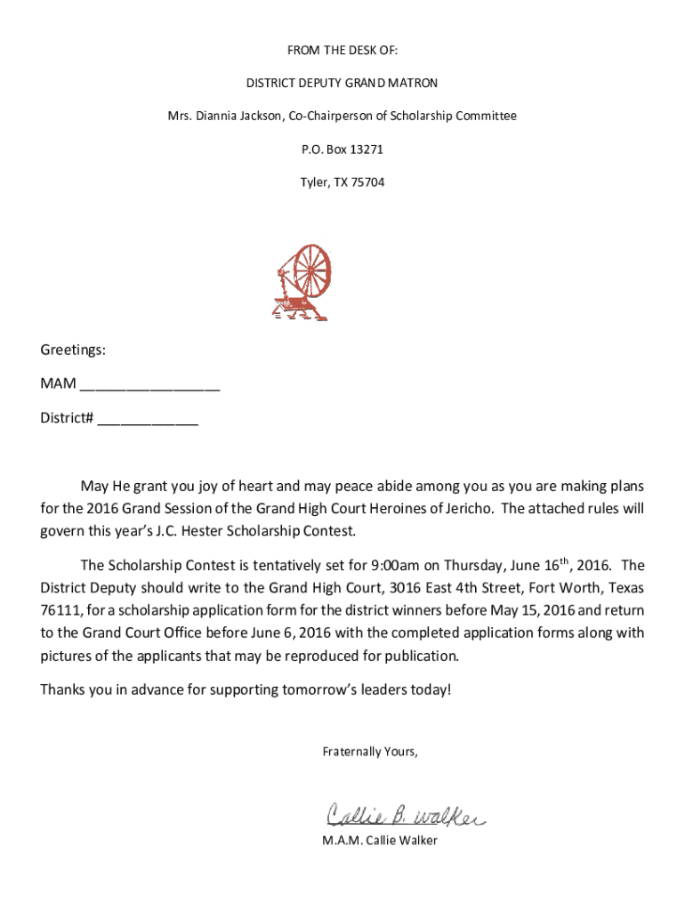 FROM THE DESK OF: DISTRICT DEPUTY GRAND MATRON Mrs. Dianna Jackson, Chairperson of Scholarship Committee P.O. Box 13271 Tyler, TX 75704Greetings: MAM ___ District# ___May He grant you joy of heart