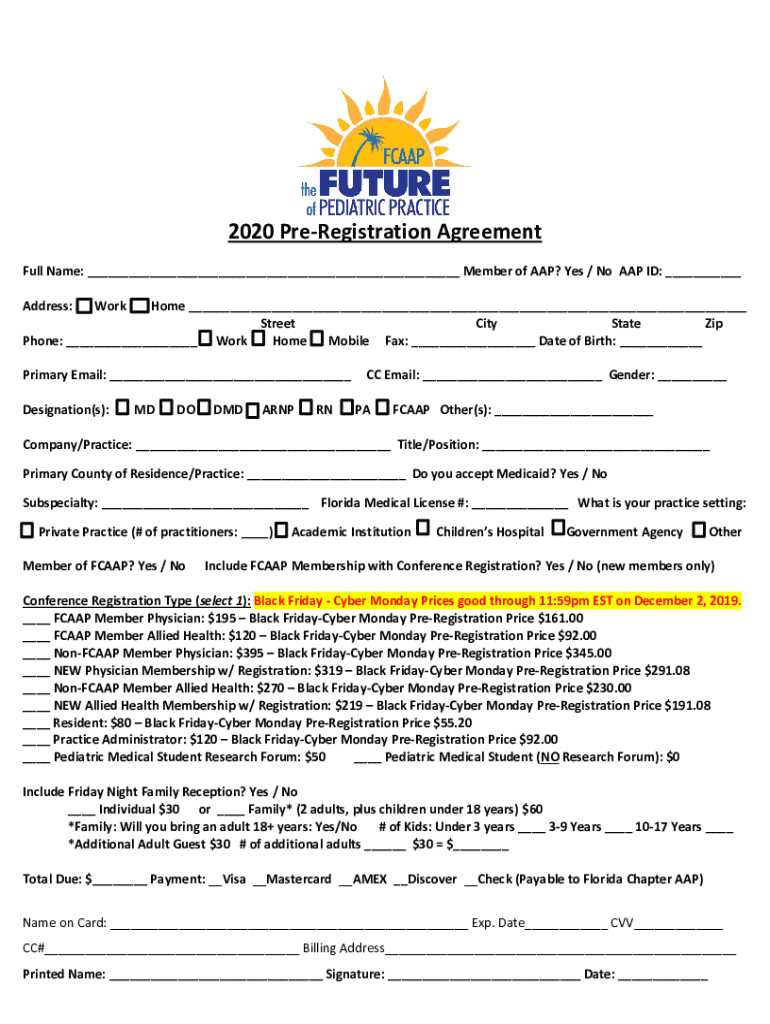 2020 Preregistration Agreement Full Name: ___ Member of AAP? Yes / No AAP ID: ___ Address:Workhouse ___ Street City State Zip Phone: ___ Work Home Mobile Fax: ___ Date of Birth: ___Primary Email: