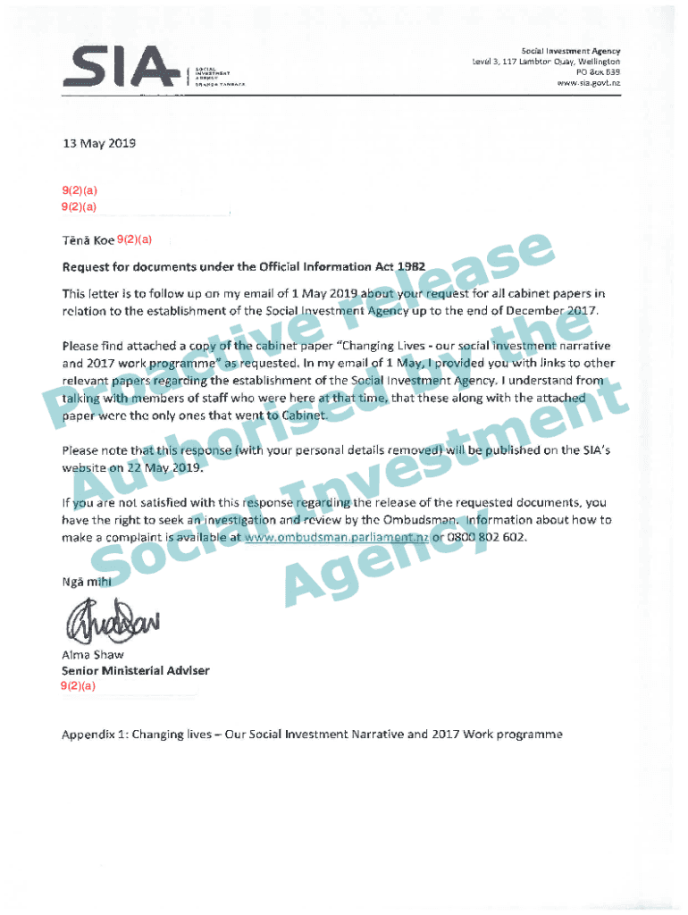S I Jr. I50COAL Invest.TAG.NCY ORANGE TANGATASocial Investment Agency Level3, 117 Lamb ton Quay, Wellington PO Box639 WWW .SIA.govt.nz13 May 20199(2)(a) 9(2)(a)Ten Joe 9(2)(a) Request for documents