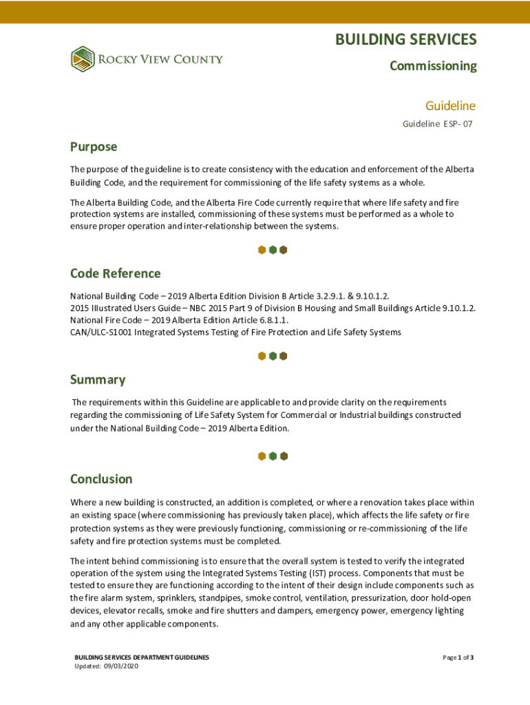 BUILDING SERVICES Commissioning Guideline ESP 07Purpose The purpose of the guideline is to create consistency with the education and enforcement of the Alberta Building Code, and the requirement for