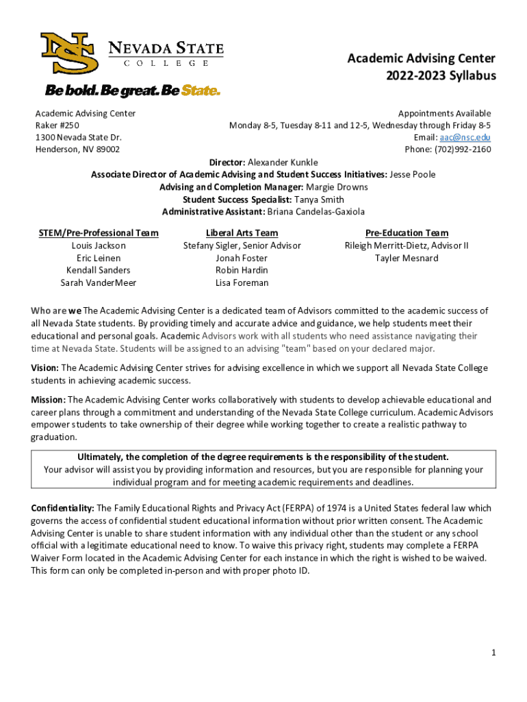 Academic Advising Center 20222023 Syllabus Academic Advising Center Baker #250 1300 Nevada State Dr. Henderson, NV 89002Appointments Available Monday 85, Tuesday 811 and 125, Wednesday through Friday