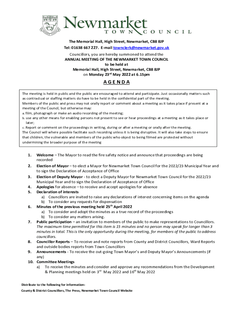 The Memorial Hall, High Street, Newmarket, CB8 8JP Tel: 01638 667 227. Email townclerk@newmarket.gov.uk Councillors, you are hereby summoned to attend the ANNUAL MEETING OF THE NEWMARKET TOWN COUNCIL