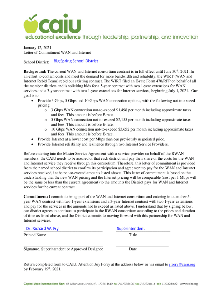 January 12, 2021, Letter of Commitment WAN and Internet Spring School District: ___ Background: The current WAN and Internet consortium contract is in full effect until June 30th, 2021. In an effort