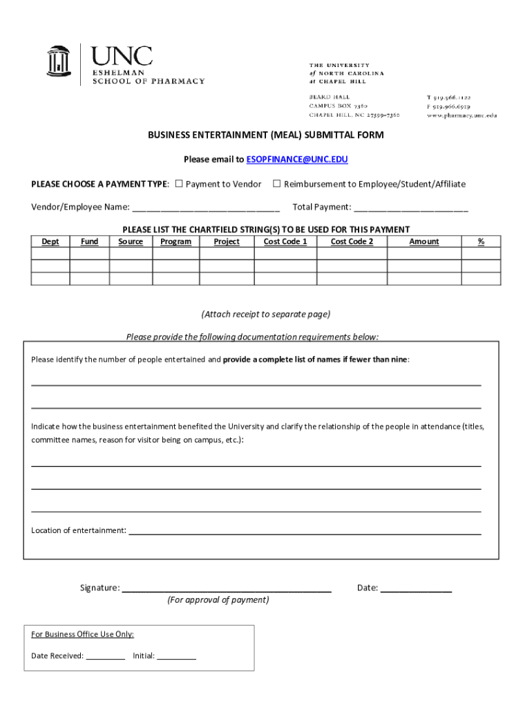 BUSINESS ENTERTAINMENT (MEAL) SUBMITTAL FORM Please email to ESOPFINANCE@UNC.EDU PLEASE CHOOSE A PAYMENT TYPE: Payment to Vendor Reimbursement to Employee/Student/AffiliateVendor/Employee Name: ___