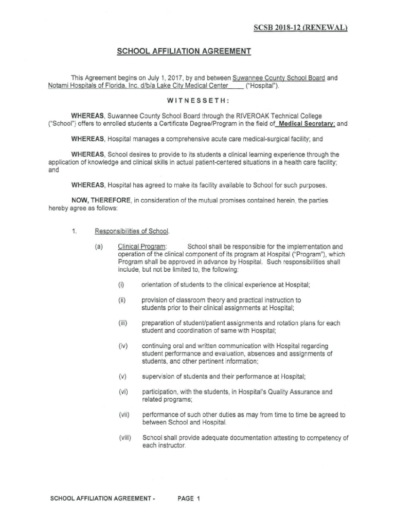 Serb 201 812 ere DEAL)SCHOOL AFFILIATION Agreements Agreement begins on July 1, 2017, by and between Suwanee County School Board and Notary Hospitals of Florida. Inc. d/b/a Lake City Medical Center