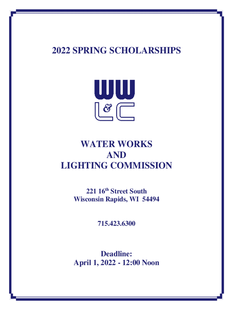 2022 SPRING SCHOLARSHIPSWATER WORKS AND LIGHTING COMMISSION 221 16th Street South Wisconsin Rapids, WI 54494715.423.6300Deadline: April 1, 2022 12:00 Newspaper Works and Lighting Commission provides