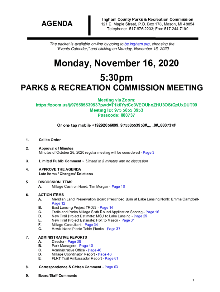 AGENDAIngham County Parks & Recreation Commission 121 E. Maple Street, P.O. Box 178, Mason, MI 48854 Telephone: 517.676.2233; Fax: 517.244.7190The packet is available online by going to bc.Ingham.org,