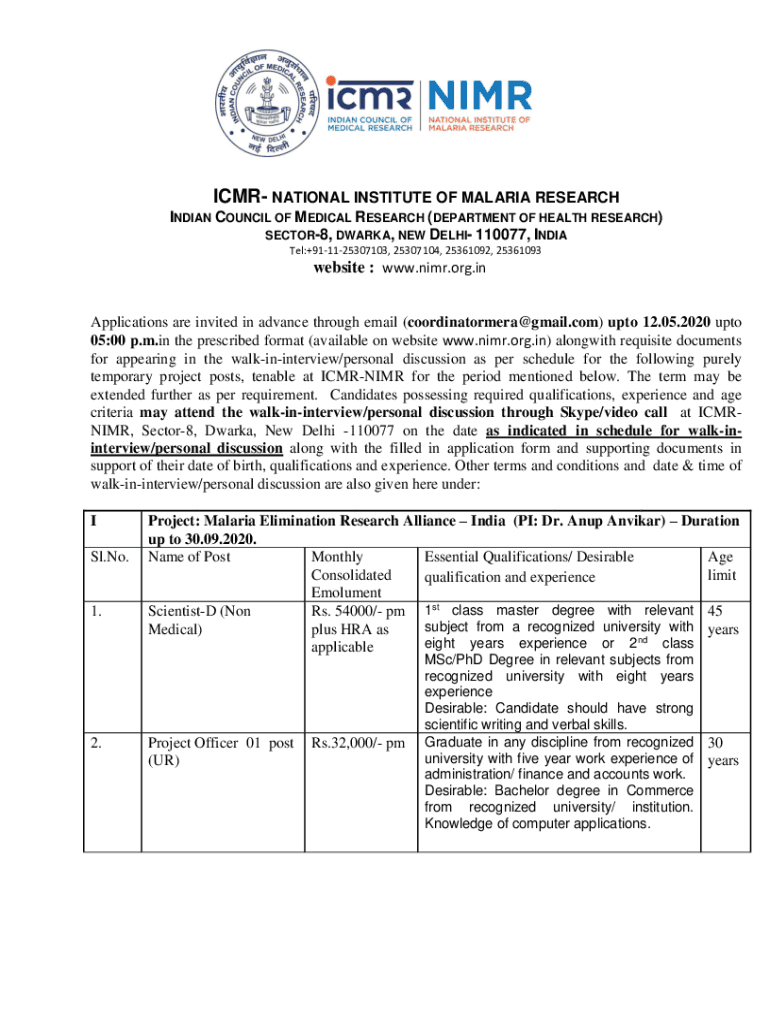 ICMR NATIONAL INSTITUTE OF MALARIA RESEARCH INDIAN COUNCIL OF MEDICAL RESEARCH (DEPARTMENT OF HEALTH RESEARCH) SECTOR8, DARK, NEW DELHI 110077, INDIA Tel:+911125307103, 25307104, 25361092, 25361093website