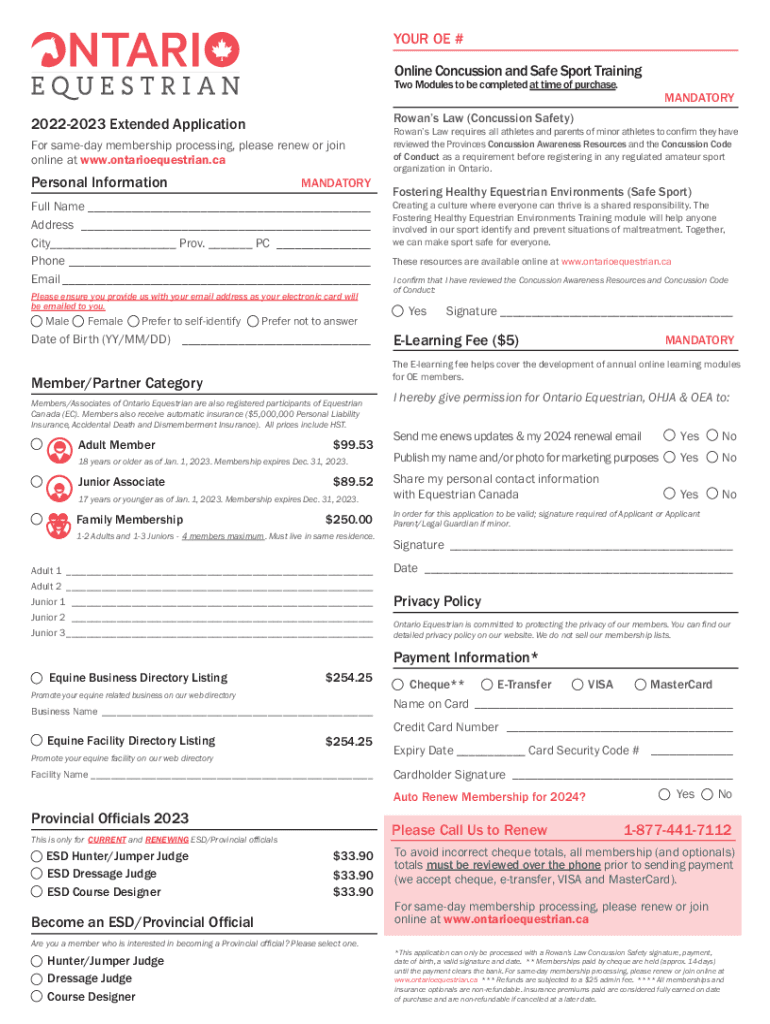 YOUR OE # Online Concussion and Safe Sport Training Two Modules to be completed at time of purchase. Rowans Law (Concussion Safety)20222023 Extended Application For someday membership processing,