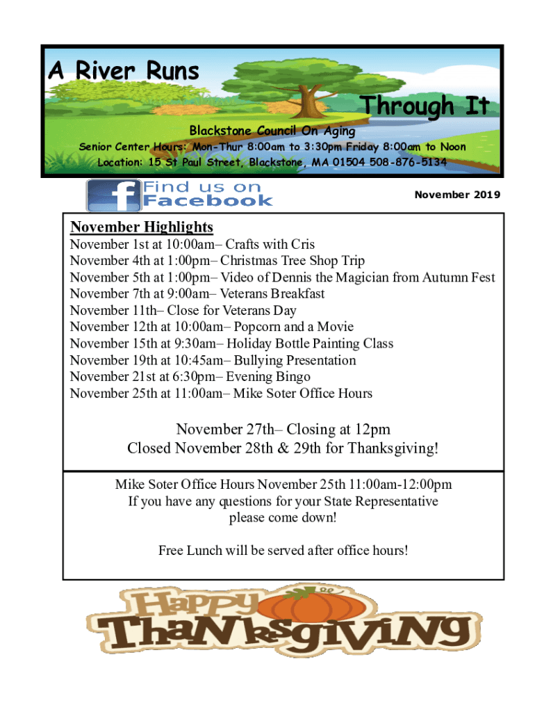 A River Runs Through It Blackstone Council On Aging Senior Center Hours: Mon Thur 8:00am to 3:30pm Friday 8:00am to Noon Location: 15 St Paul Street, Blackstone, MA 01504 5088765134 November 2019November