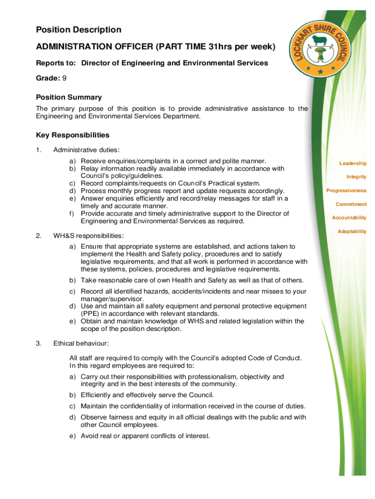 Position Description ADMINISTRATION OFFICER (PART TIME 31hrs per week) Reports to: Director of Engineering and Environmental Services Grade: 9 Position Summary The primary purpose of this position