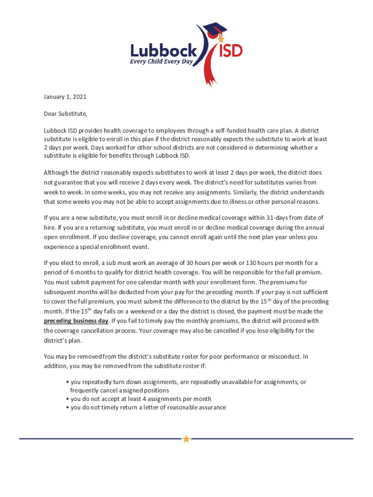January 1, 2021, Dear Substitute, Lubbock ISD provides health coverage to employees through a self funded health care plan. A district substitute is eligible to enroll in this plan if the district