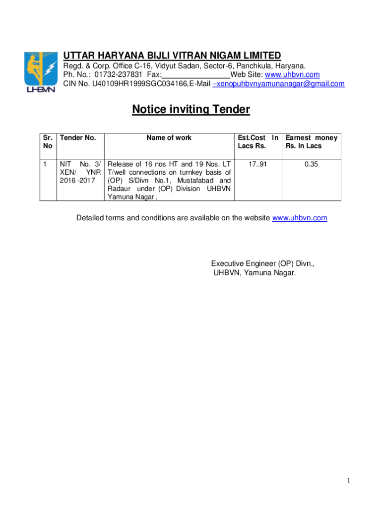 UTTER HARYANA BILL VETERAN NI GAM LIMITED Red. & Corp. Office C16, Vilyui Sudan, Sector6, Patchouli, Haryana. PH. No.: 01732237831 Fax:___ Website: www.uhbvn.com IN No. U40109HR1999SGC034166,Email
