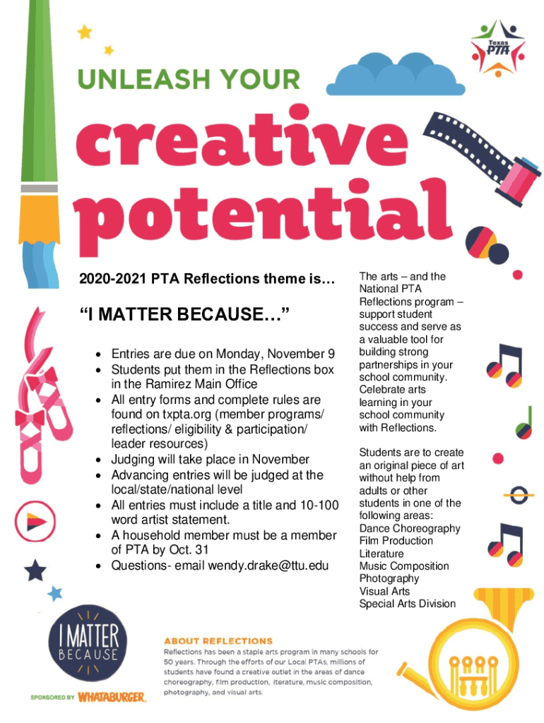 20202021 PTA Reflections theme ISI MATTER BECAUSE Entries are due on Monday, November 9 Students put them in the Reflections box in the Ramirez Main Office All entry forms and complete rules are found