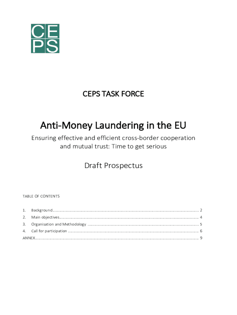 CEPS TASK FORCEAntiMoney Laundering in the EU Ensuring effective and efficient cross border cooperation and mutual trust: Time to get seriousDraft ProspectusTABLE OF CONTENTS 1. Background .....................................................................................................................................