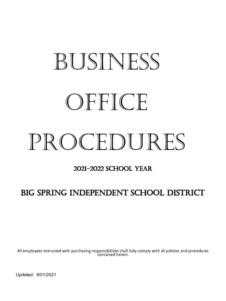 Business Office Procedures 20212022 School Yearning Spring Independent School District employees entrusted with purchasing responsibilities shall fully comply with all policies and procedures contained