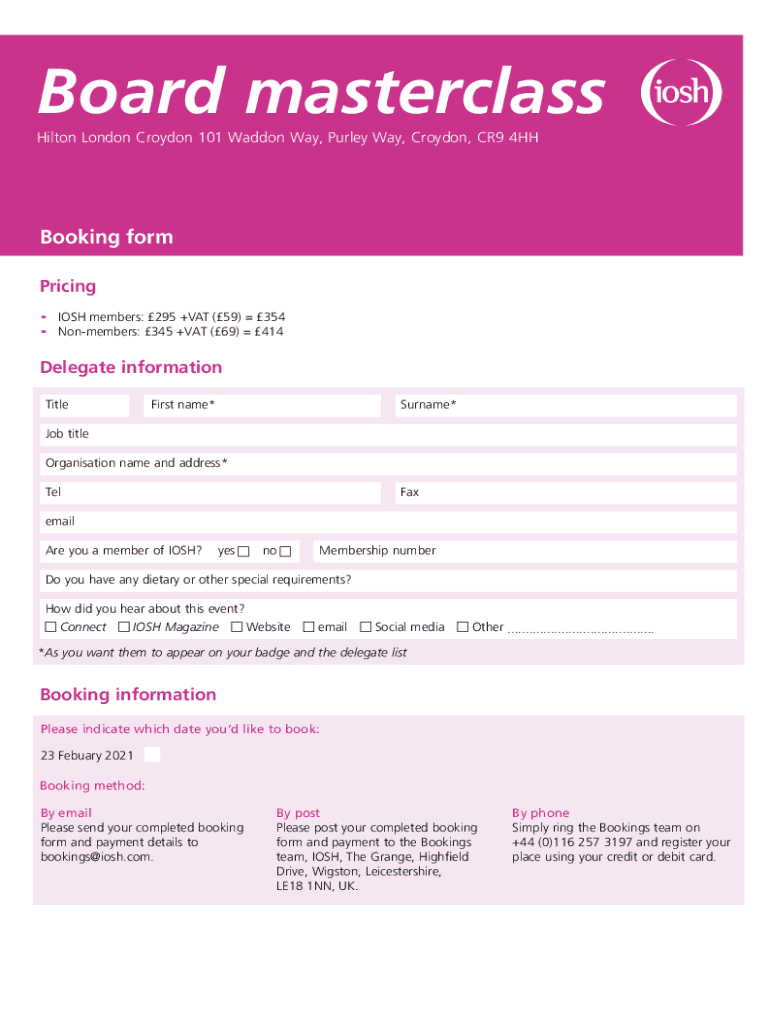 Board masterclass Hilton London Croydon 101 Wad don Way, Purely Way, Croydon, CR9 4HHBooking form Pricing JOSH members: 295 +VAT (59) 354 Nonmembers: 345 +VAT (69) 414Delegate information Titlist