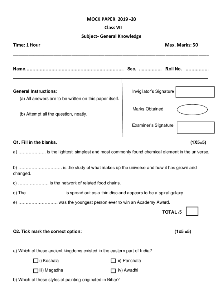 MOCK PAPER 2019 20 Class VII Subject General Knowledge Time: 1 Hour Max. Marks: 50___ Name. Sec. . Roll No. . ___ Invigilators SignatureGeneral Instructions: (a) All answers are to be written on this