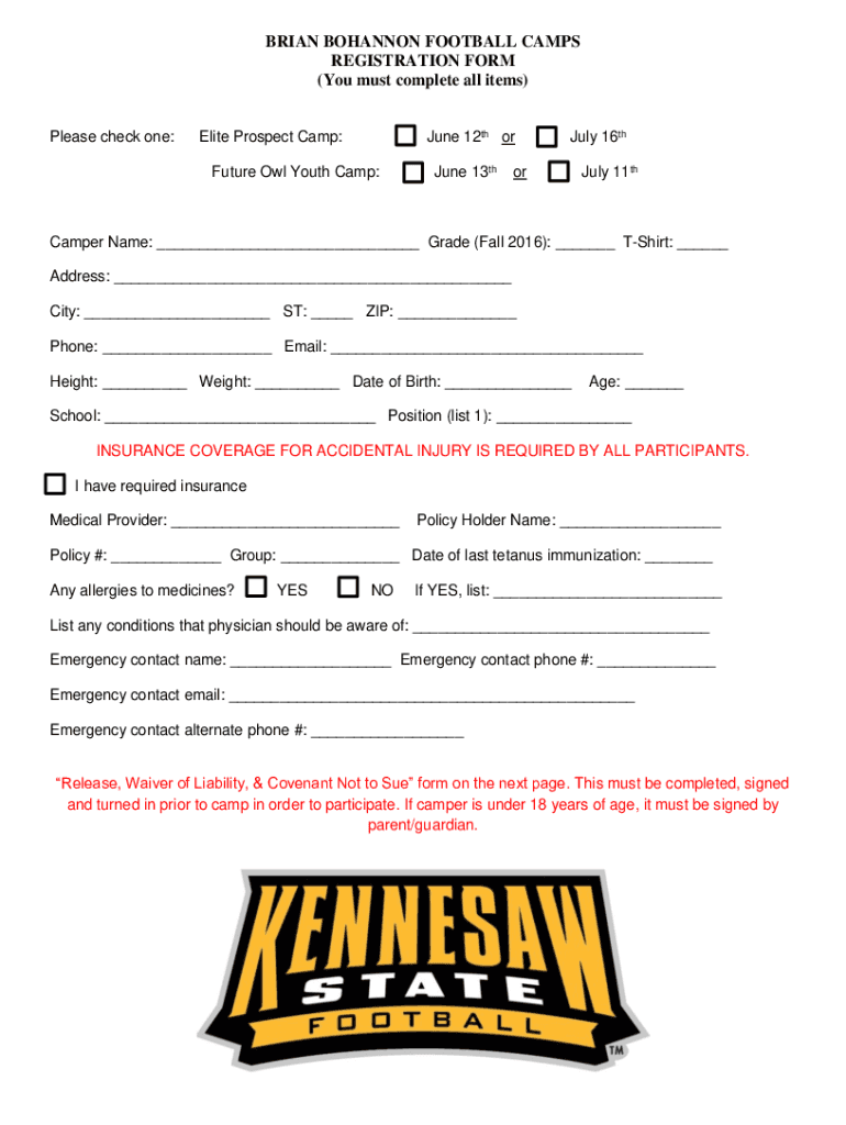 BRIAN SHANNON FOOTBALL CAMPS REGISTRATION FORM (You must complete all items) Please check one:June 12th elite Prospect Camp: Future Owl Youth Camp:June 13thJuly 16thorJuly 11thCamper Name: ___ Grade
