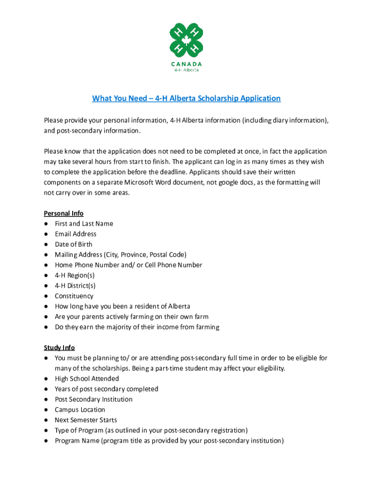What You Need 4H Alberta Scholarship Application Please provide your personal information, 4H Alberta information (including diary information), and postsecondary information. Please know that the